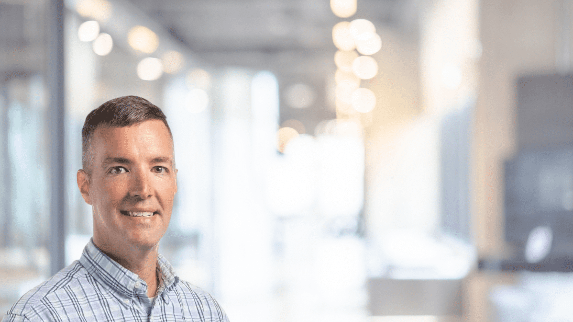 Confident professional smiling in a modern office setting with ambient lighting.
