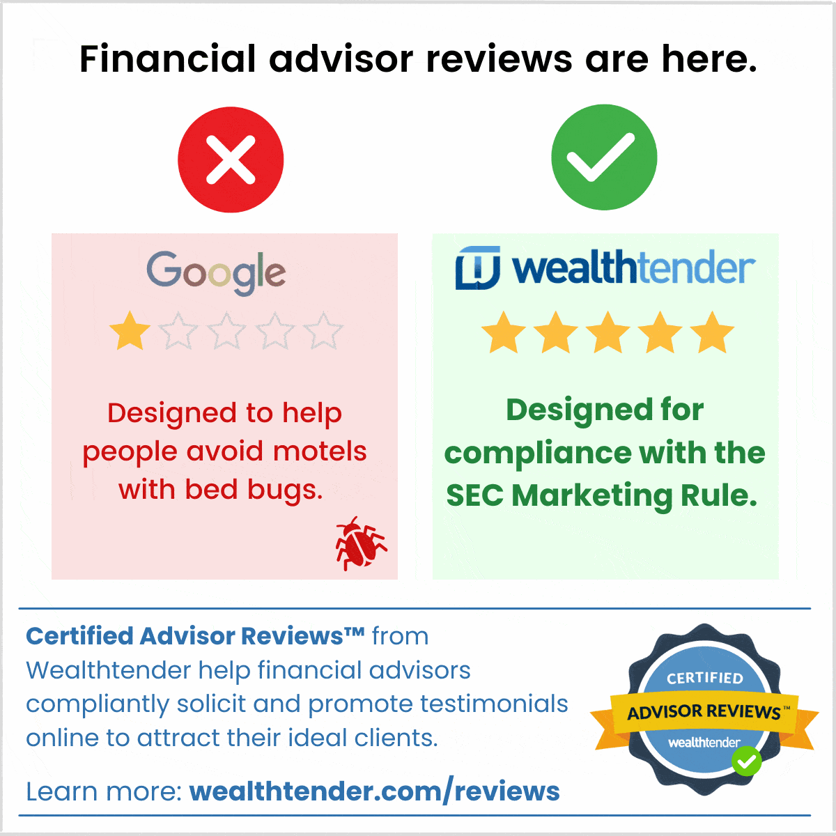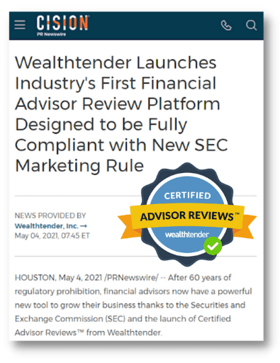 Certified Advisor Reviews™ help consumers make smarter hiring decisions when choosing a financial advisor. Wealthtender is the first financial advisor review platform designed to be fully compliant with the SEC Investment Adviser Marketing rule.