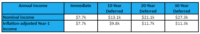 - For a 10-year deferment, the annuity still comes out ahead, $9.8k vs. $7.3k – a healthy 34% edge.